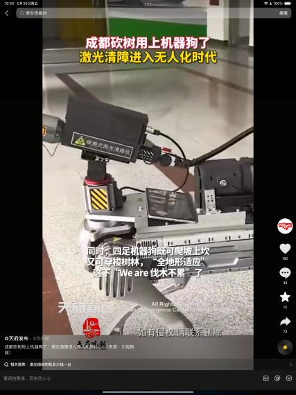 近日,一段“四足机器人搭载激光炮进行树木清障作业”的短视频登上热搜,多个主流媒体平台相继报道,包括@成都发布、@天府发布、@大象新闻等均纷纷转发评论,一时间,“激光炮+机器狗”的组合引发社会各界的高度关注。